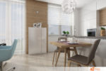 Kuchyňský kout může využívat kompaktní skříňky s čistými liniemi, které nabízejí dostatek úložného prostoru. Spotřebiče s menšími rozměry a energeticky šetrnými funkcemi snadno zapadnou do celkového konceptu. Nad pracovní plochu se hodí instalovat poličky nebo háčky na nádobí, čímž se ušetří místo.