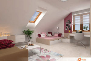 Pokoj se sešikmeným stropem působí útulně a originálně. Světle zelená barva na zdech vytváří svěží atmosféru, která připomíná jarní ráno. Stejný odstín nese i židle u psacího stolu, čímž vzniká příjemná barevná harmonie. Stůl stojí u stěny pod šikmým oknem, kudy do místnosti proudí denní světlo a osvětluje celý pracovní kout. Rozkládací postel V rohu […]