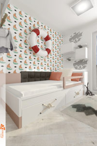 Pokojík působí jako kajuta malého mořeplavce. Návrh s tapetou na jedné ze stěn připomíná podmořský svět – hejna ryb, medúzy i korály se vlní v modrozelených odstínech, mezi nimi proplouvá majestátní velryba. Prostor laděný do modra navozuje pocit hlubin, ticha a dobrodružství pod hladinou. Na dřevěné poličce se vyjímá pečlivě zpracovaná modelová loď s plachtami […]