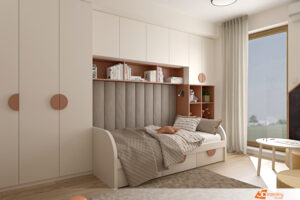 Dětský pokoj s dvěma postelemi rozmístěnými v protilehlých rozích působí prakticky a útulně. Návrh pro dvě děti se světlými stěnami, dřevěnou podlahou a jednoduchým nábytkem, tvoří příjemné prostředí pro hru, odpočinek i soustředění. Každá postel má nad sebou úložný prostor v podobě bílých skříní s čistými liniemi. Ty ukrývají hračky, knížky, deky nebo sezónní věci, […]